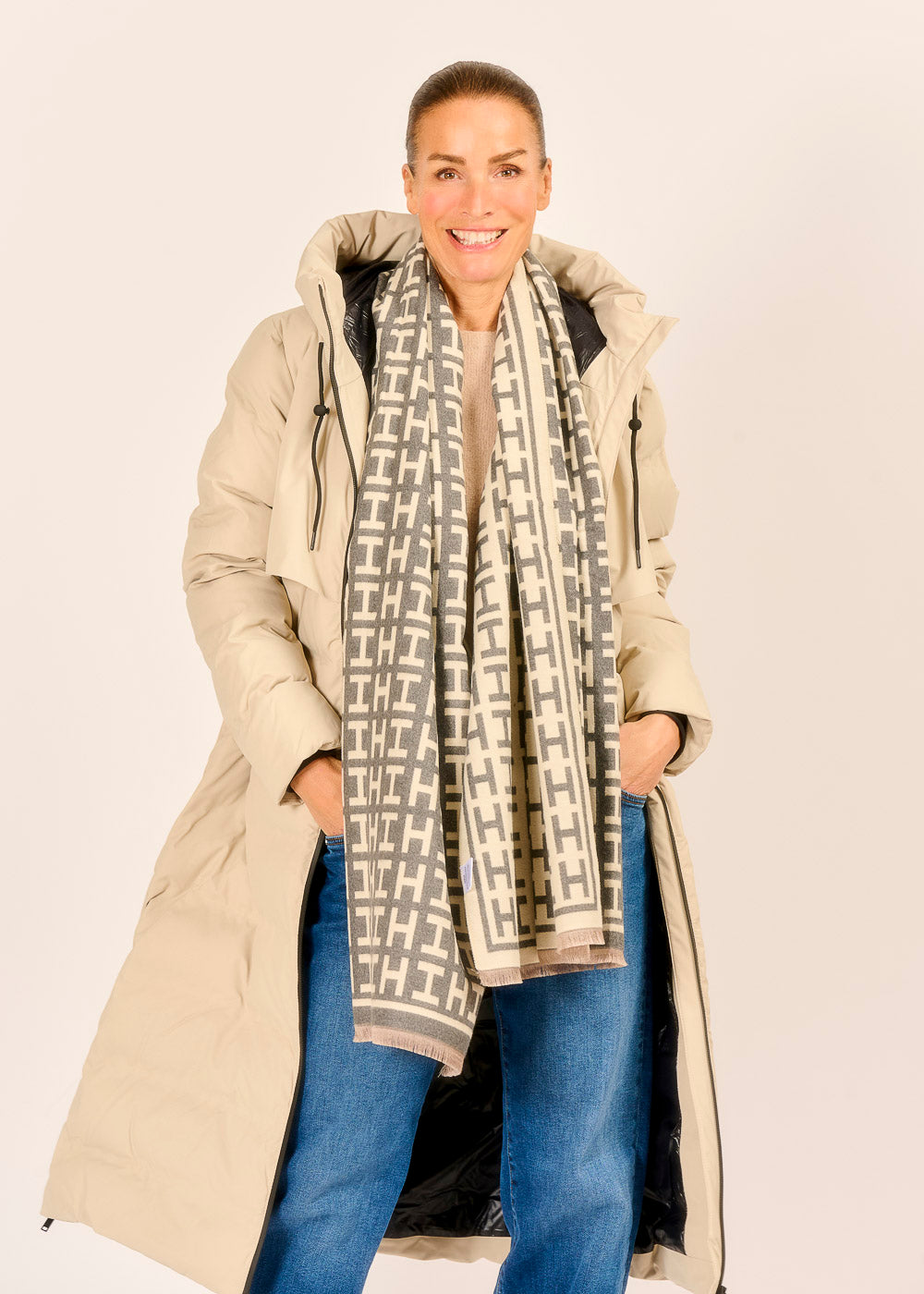 Mit diesem eleganten Schal setzen Sie ein Statement, denn das markante, grafische H-Muster in stilvollen Grau- und Beigetönen sorgt für einen edlen Wiedererkennungswert. Gehüllt in dieses Tuch genießen Sie eine luxuriöse Wärme und ein angenehm weiches Tragegefühl, das Sie stilvoll durch die kühle Jahreszeit begleitet. Mit seinem zeitlosen Design und den feinen Fransen ist dieser Schal ein perfekter Akzent, der jedem Outfit eine subtile, aber selbstbewusste Note verleiht.