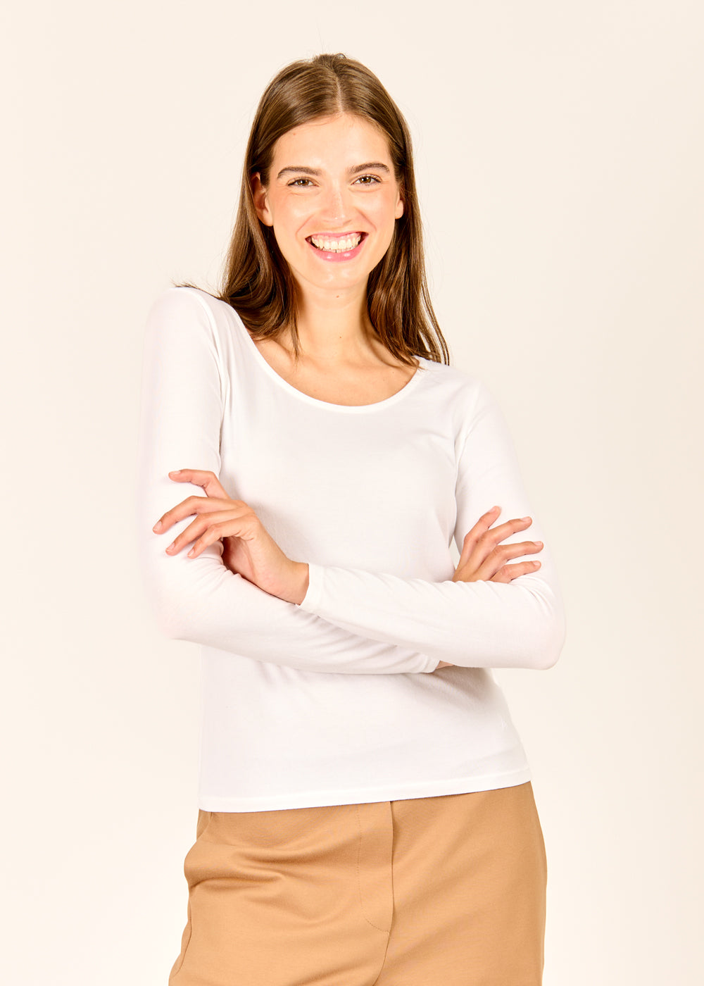 Ein unverzichtbares Basic, das in keiner Garderobe fehlen darf: Dieses schlichte Langarmshirt in zeitlosem Weiß überzeugt durch sein weiches Material und den figurbetonten Schnitt. Der elegante U-Boot-Ausschnitt setzt feminine Akzente, während der dezente Look unzählige Kombinationsmöglichkeiten eröffnet. Perfekt für einen lässigen Alltag oder als Grundlage für ein aufregendes Outfit.