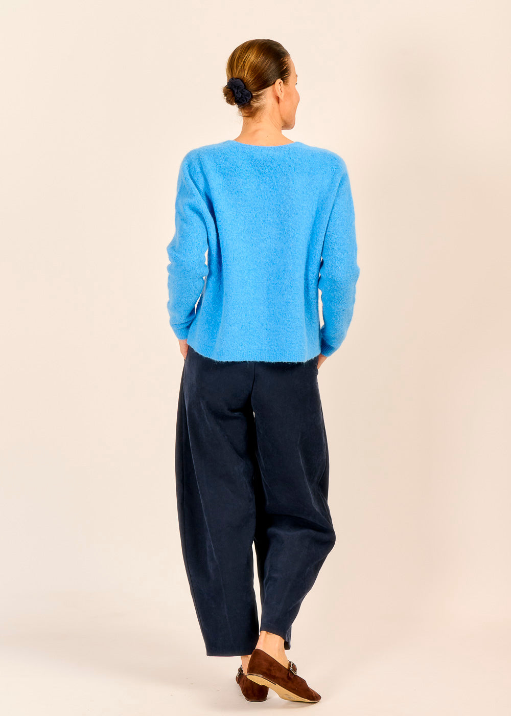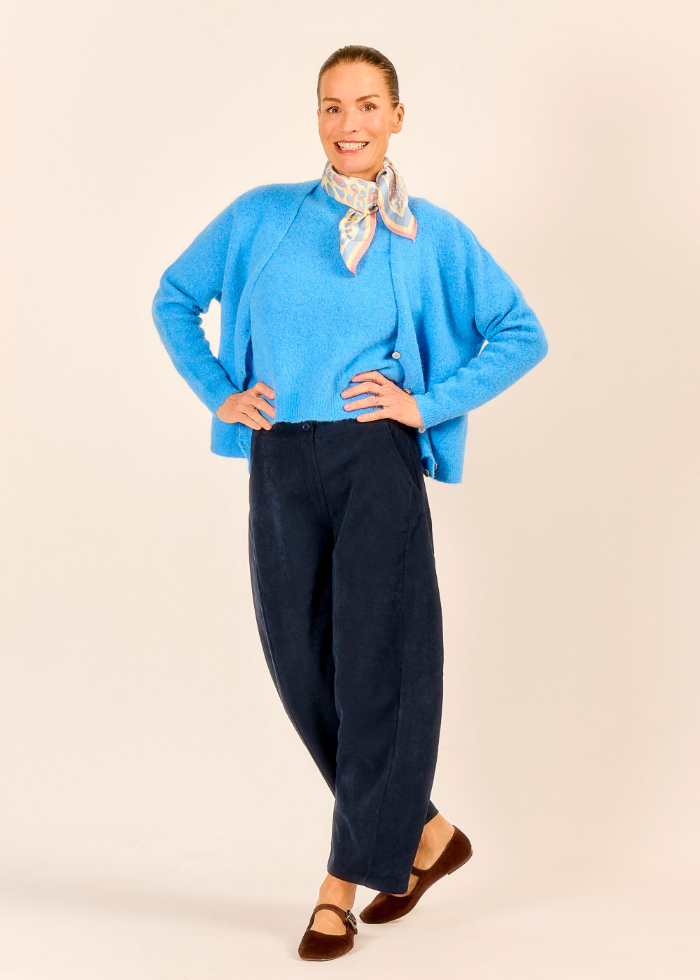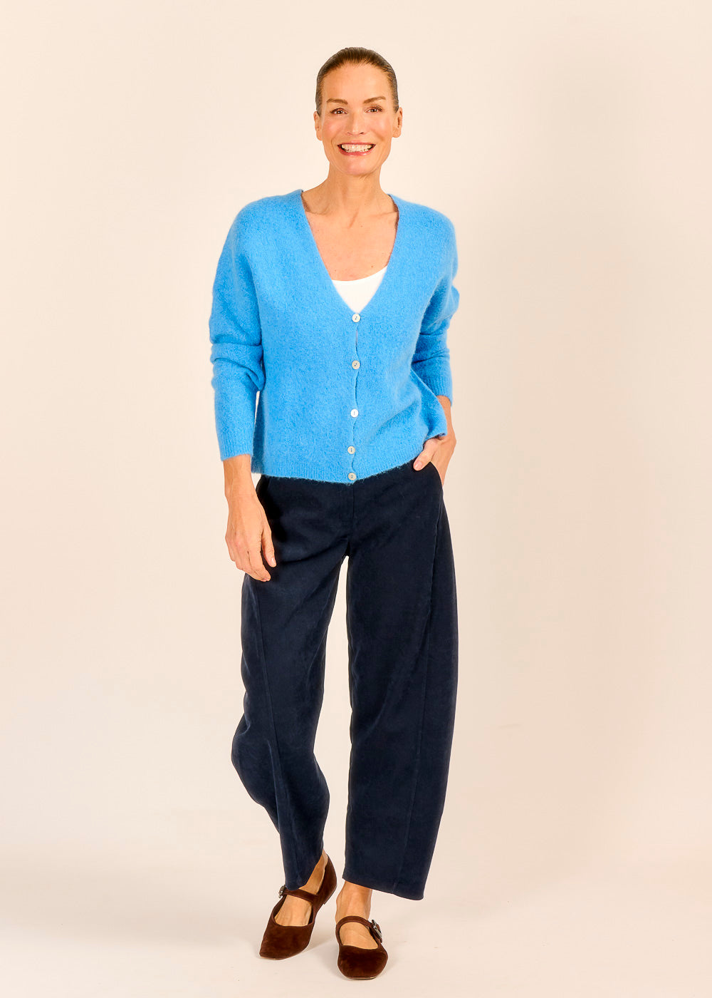 Der Cardigan aus feinster Baby Alpaka und Merino Wolle strahlt schon allein dank des strahlenden Blautons Frische und Leichtigkeit aus. Blitzt unter dem weiten Ausschnitt ein Trägertop hervor, wirkt der Look besonders lässig und hält dich dabei gleichzeitig warm. Kombiniert mit unserem Halbarm Pullover wird er zum stilvollen Layering-Piece.