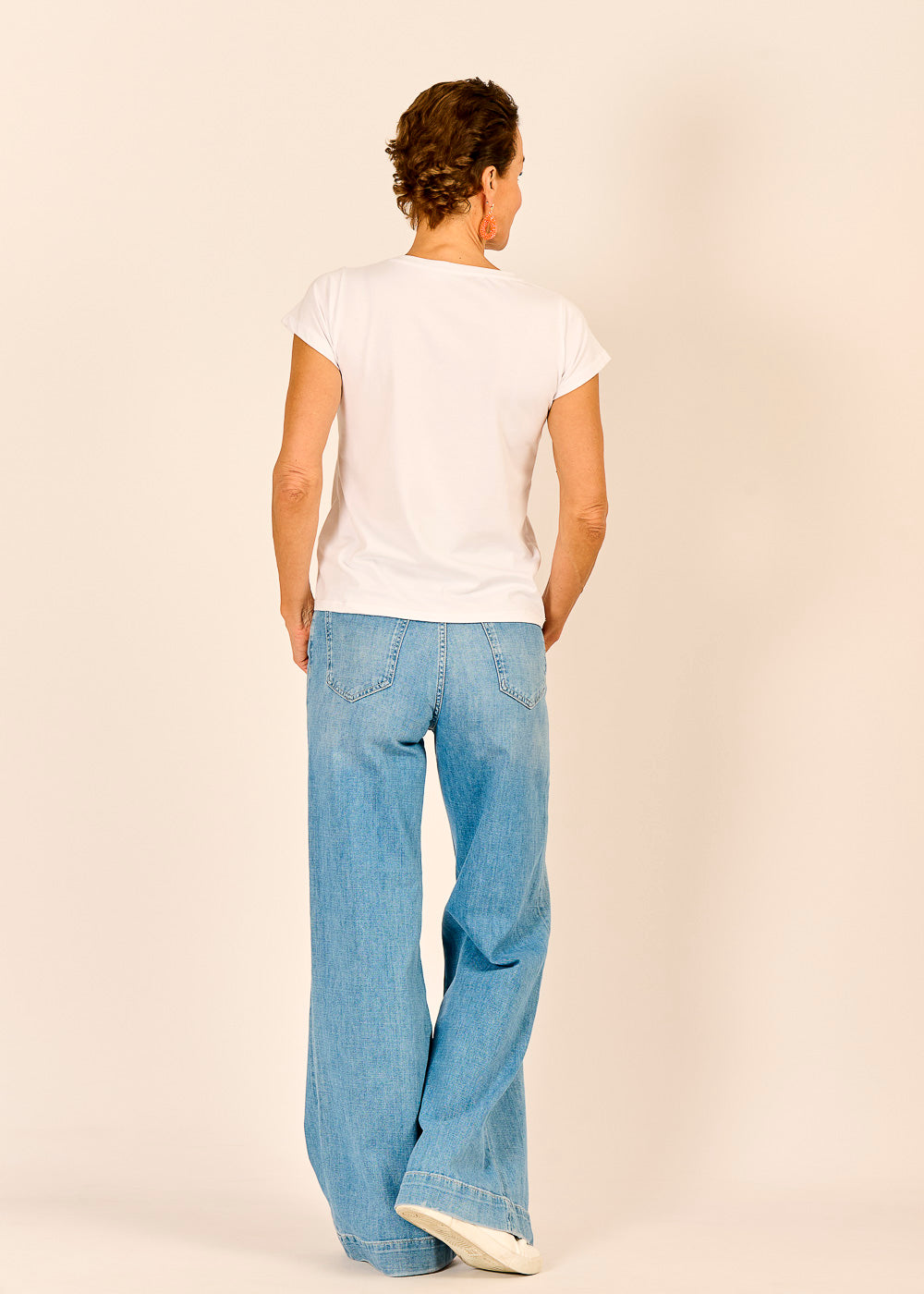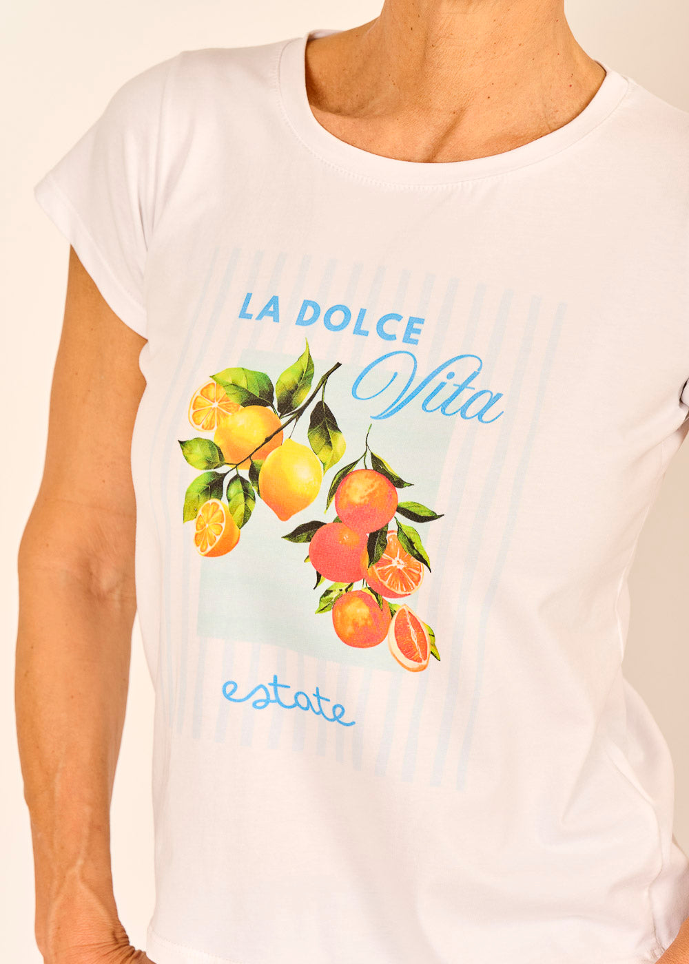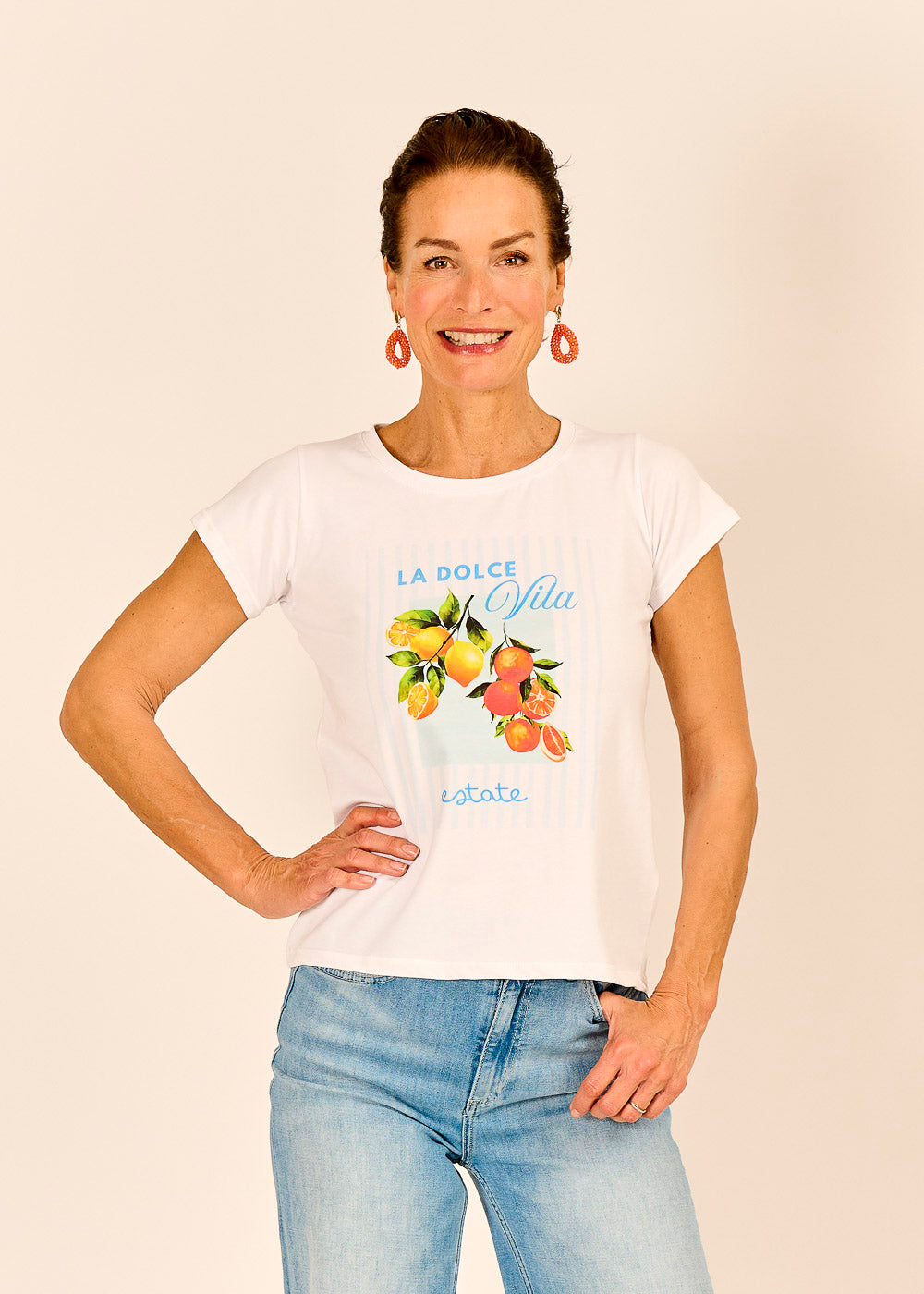 Ein Hauch von italienischer Leichtigkeit trifft auf zeitlosen Style: Dieses weiße Shirt mit dem Schriftzug „La Dolce Vita“ verkörpert pure Lebensfreude. Der klare Look wird durch den charmanten Print zu einem Statement für Genuss, Sonne und das süße Leben. Lässig kombiniert wird es zum perfekten Begleiter für alle, die jeden Tag ein bisschen Urlaubsgefühl tragen möchten.